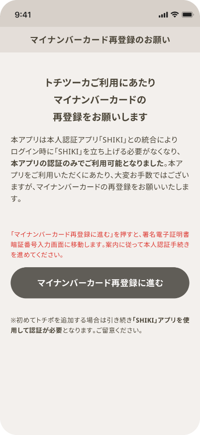 トチツーカアプリではマイナンバーカード本人認証アプリ「SHIKI」を利用して本人確認を行っておりますが、このたびアプリの利便性向上のため、トチツーカアプリのみでご利用いただけるようトチツーカアプリのアップデートを予定しています。